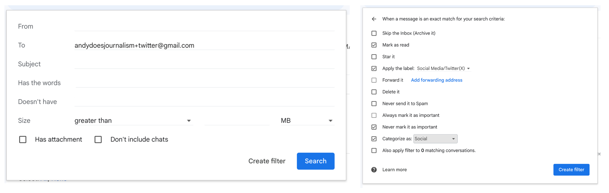 Most email apps will allow you to make aliases in your account - different email addresses that all end up in the same email inbox. Gmail for example, has an easy way to generate new email addresses by using the + sign. I could create a new email for X by adding +x or +twitter to the email like this andydoesjournalism+x@gmail.com or andydoesjournalism+twitter@gmail.com