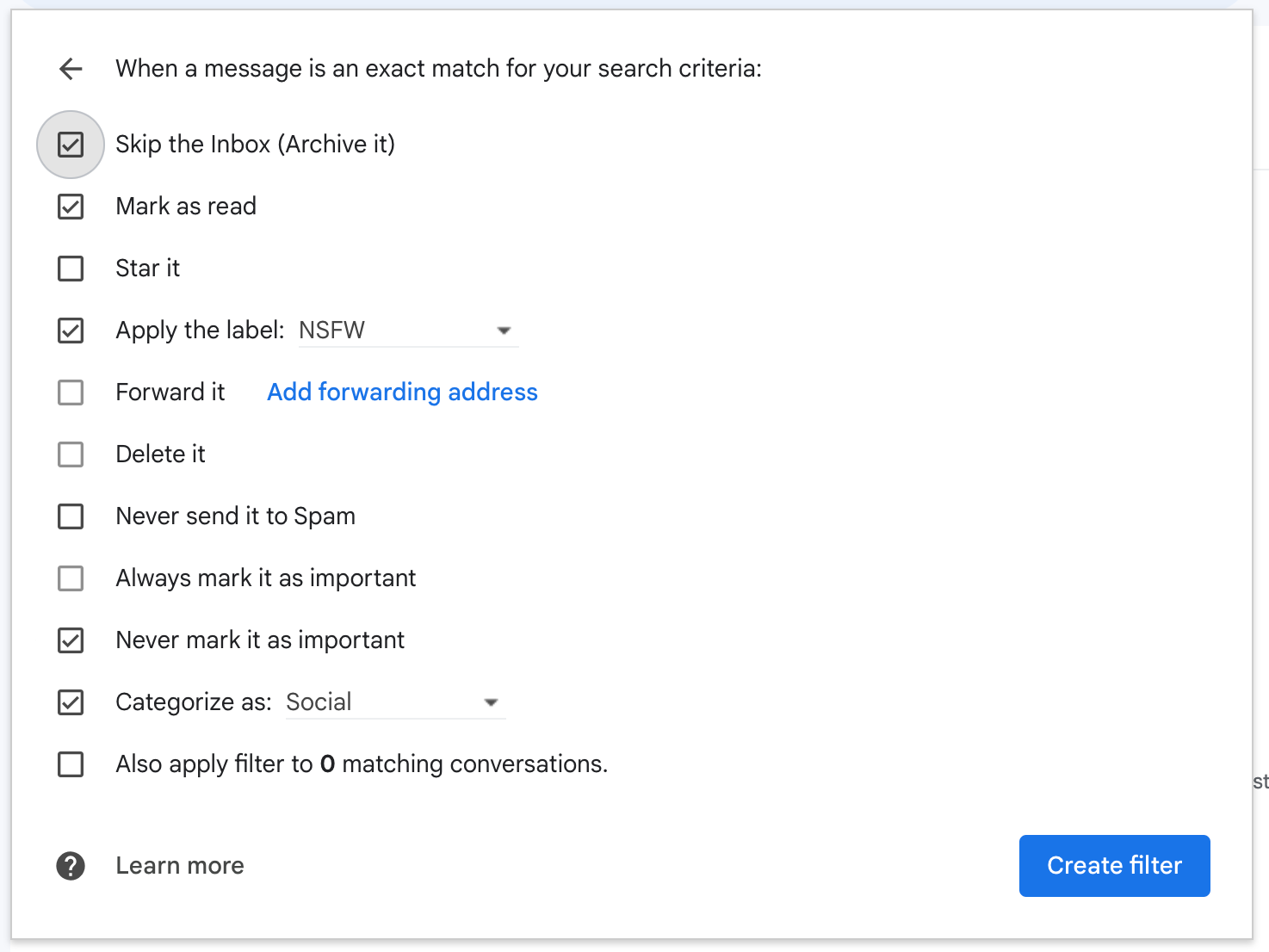 Using a separate email to manage your interaction and experiments with social media platforms, opens up a chance to use the built-in functions of your email client to help keep interaction at arm's length.